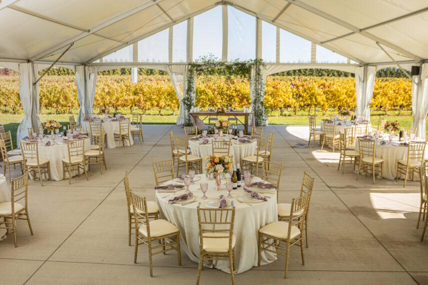 A wedding tent at the Bella Terra Vineyard with a view of vines in the back drop.