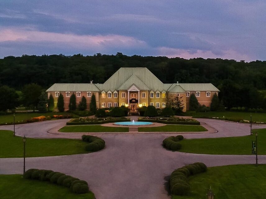 an evening view of Château des Charmes from a distance in Niagara-on-the-Lake.