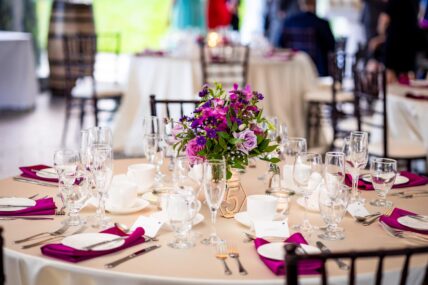 Tented celebrations have become a staple of modern weddings because of their style and complete versatility. A tent acts as a blank canvas, allowing you to customize virtually every detail of your wedding, from flooring to lighting, while still offering the space and comfort of an indoor venue. Set up a floral wall to create a stunning visual and the ideal spot for photos, choose the perfect mood lighting, and select a picturesque locale. Vineyards are a popular option for many couples.