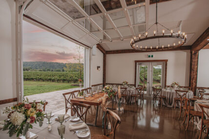Perched above their vast vineyards just outside The Barns, you’ll find this dreamy wedding ceremony site. Exchange your vows al fresco with scenic views of the tree lined Escarpment.