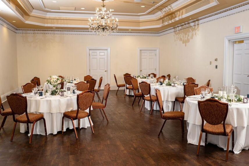 Waterfront views and antique elegance await at Queen’s Landing. This Georgian-style mansion exudes timeless sophistication, with its grand architecture, manicured gardens, and picturesque views. From the sparkling chandeliers to the impeccable service, every detail enhances the joy of the occasion, ensuring your engagement celebration is as unforgettable as the moment itself.