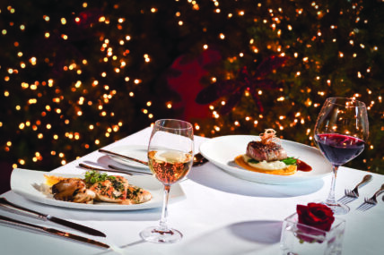Christmas dinner promises hearty holiday fare such as a thyme roasted turkey breast or ribeye roast. To top off the holiday feast, guests can indulge in a delectable dessert selection featuring your choice of either white chocolate cheesecake or coffee and Baileys crème brûlée.