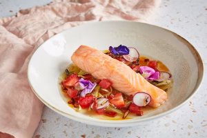 Immerse yourself in the essence of summer with our Confit Salmon, prepared with Chorizo, strawberries, watermelon, and fennel. A culinary masterpiece crafted by Executive Chef Nicholas Petitjean. The combination may seem unconventional, but the zest and sweetness of strawberries, coupled with the refreshing taste of watermelon, perfectly complements the richness of salmon, creating a harmonious explosion of flavors.