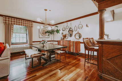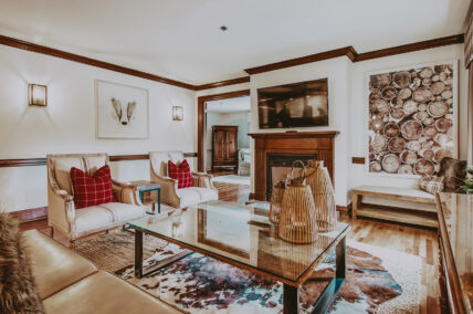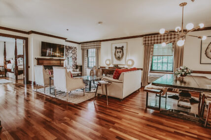 Luxurious, uniquely decorated and our most spacious two room accommodation with a king bed, hardwood flooring, a gas fireplace and chaise lounge. This recently renovated suite at Pillar and Post includes an ensuite bathroom with a whale soaker tub and glass walk-in shower. Enjoy a full sitting area, a dining area featuring a harvest table, a wet bar and a separate powder room.