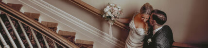 Newlyweds sharing a private moment on the staircase at the Queens Landing Hotel in Niagara-on-the-Lake