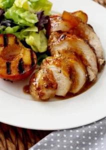 Oil the chicken breasts and season with sea salt then grill until cooked through. When the chicken is finished, lather a generous amount of the peach glaze on the breast and add some nice salad greens and serve.